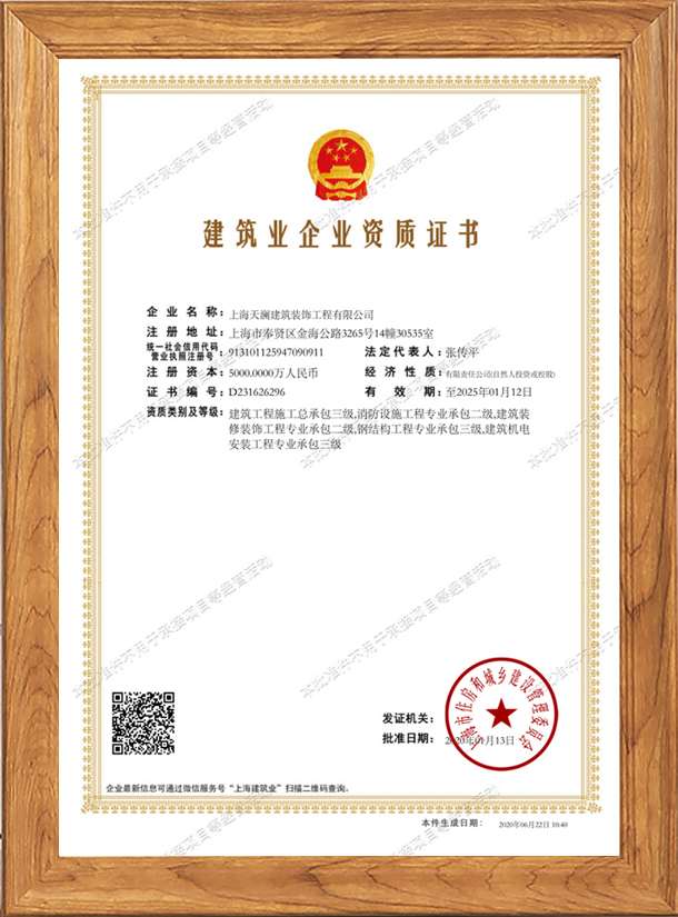 上海天瀾建筑裝飾工程有限公司是上海工商行政管理局注冊登記的專業(yè)上海工裝公司。我司主要從事凈化車間工程、廠房辦公室工程、鋼結(jié)構(gòu)搭建工程餐飲娛樂工程酒店公寓工程、展覽展示工程等業(yè)務(wù)。我司是建筑工程施工總承包三級消防設(shè)施工程專業(yè)承包二級,建筑裝修裝飾工程專業(yè)承包二級,鋼結(jié)構(gòu)工程專業(yè)承包三級,建筑機電安裝工程專業(yè)承包三級、上海市建設(shè)和交通委員會頒發(fā)的“安全生產(chǎn)許可證”公司自成立以來堅持“質(zhì)量是企業(yè)生命信譽是發(fā)展之道、服務(wù)是競爭之魂”發(fā)展理念。公司擁有優(yōu)秀的服務(wù)團隊、在潛心服務(wù)客戶中在不斷經(jīng)營發(fā)展中樹立了良好的企業(yè)形象和口碑。